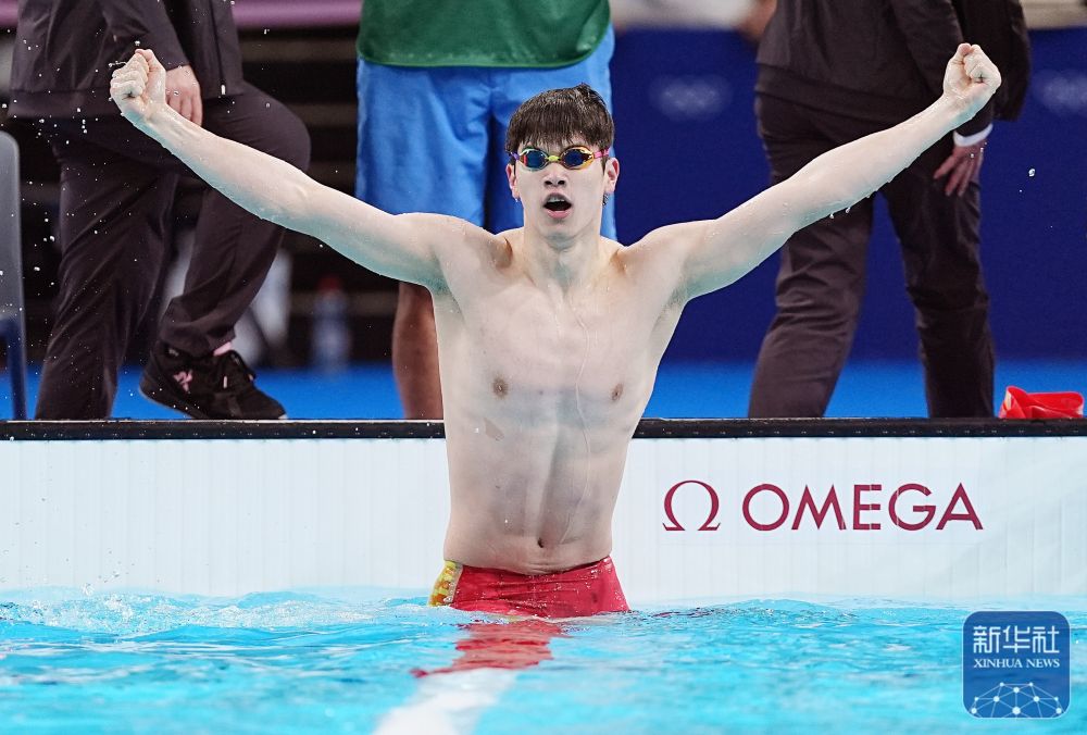 ↑中国选手潘展乐在巴黎奥运会游泳男子100米自由泳决赛后庆祝夺冠及打破世界纪录(2024年7月31日摄)。新华社记者 杜宇 摄