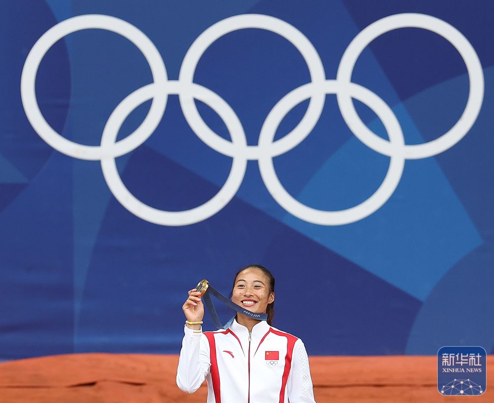 ↑2024年8月3日,郑钦文在巴黎奥运会网球女子单打金牌赛中2比0战胜克罗地亚选手维基奇,获得中国队历史首枚奥运网球单打金牌。新华社记者 赖向东 摄