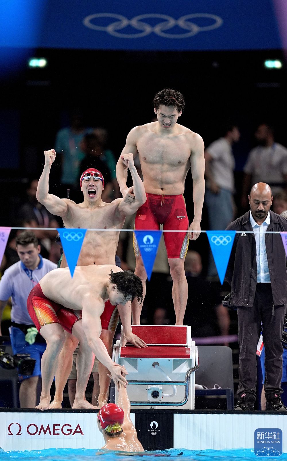 ↑2024年8月4日,中国队选手在巴黎奥运会游泳项目男子4x100米混合泳接力决赛后庆祝夺冠。新华社记者 杜宇 摄