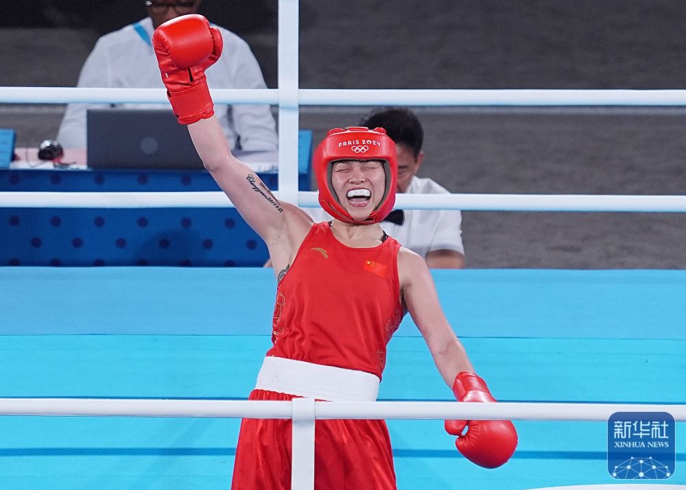 ↑2024年8月8日,常园在巴黎奥运会拳击项目女子54公斤级决赛后庆祝夺冠。新华社记者张帆 摄