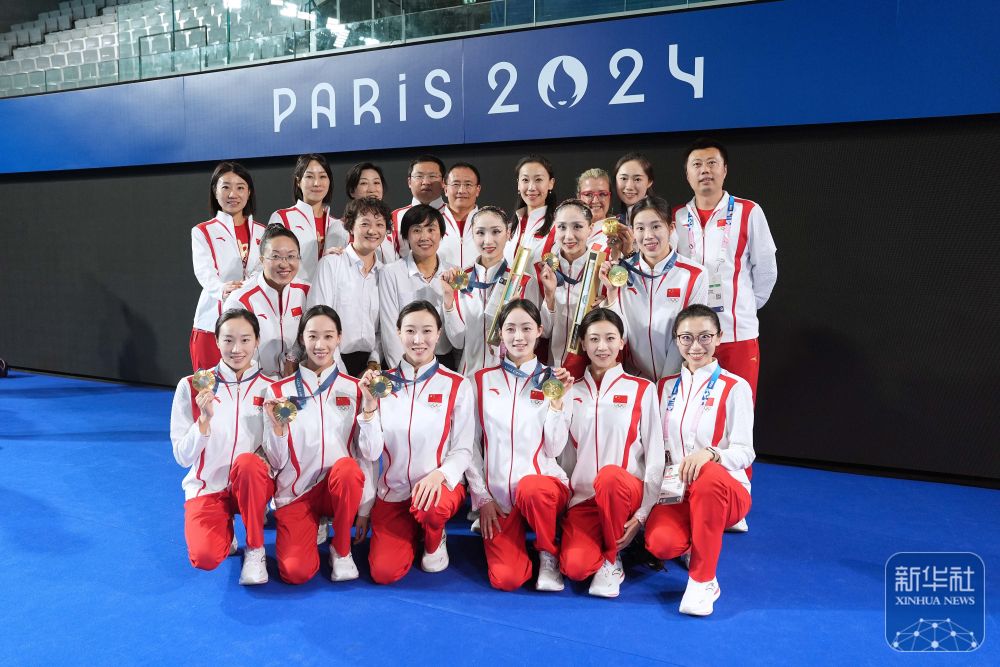 ↑2024年8月10日,巴黎奥运会花样游泳冠军中国队成员在颁奖仪式后合影。中国花样游泳队首次奥运见金,就包揽集体和双人项目两金。新华社记者薛宇舸 摄