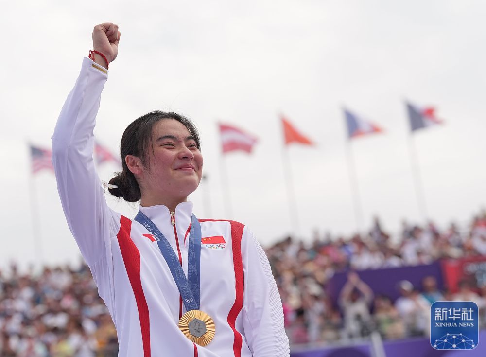↑2024年7月31日,中国首位自由式小轮车奥运冠军邓雅文在巴黎奥运会自由式小轮车女子公园赛颁奖仪式上。新华社记者 李一博 摄