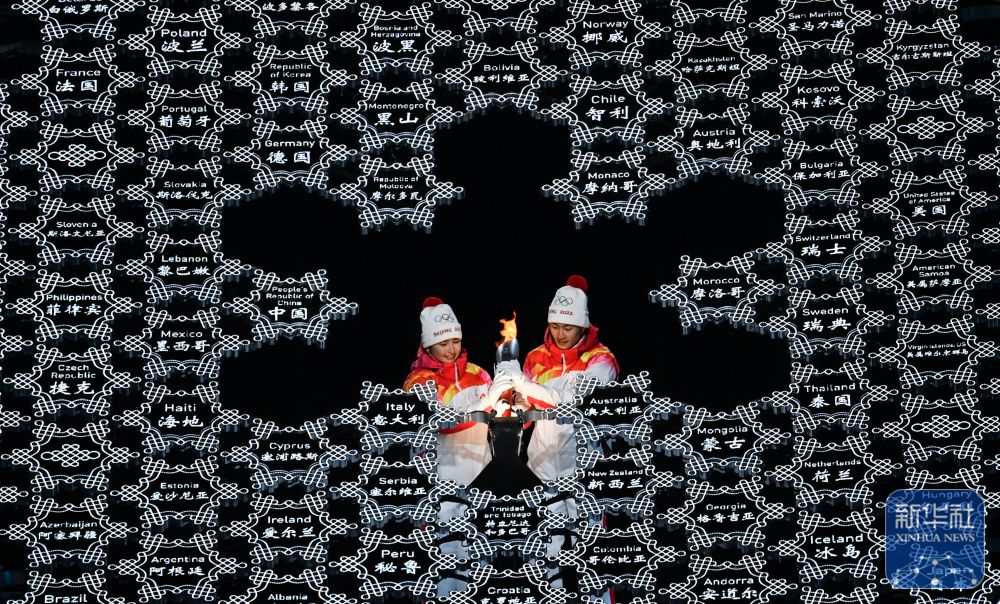 ↑2022年2月4日晚,第二十四届冬季奥林匹克运动会开幕式在北京国家体育场举行。这是最后一棒火炬手迪妮格尔·衣拉木江(左)和赵嘉文将火炬嵌入“大雪花”中央。新华社记者 李尕 摄