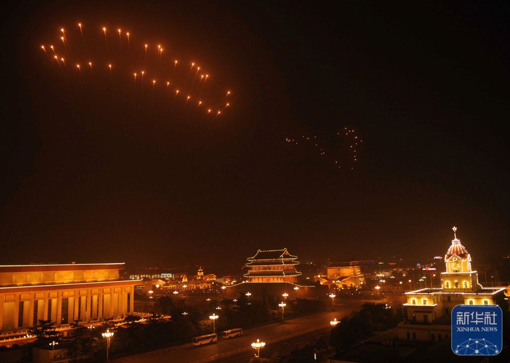 ↑2008年8月8日拍摄的天安门广场上空燃放的北京奥运会开幕式焰火《历史足迹》上的“脚印”。新华社记者 郝远征 摄