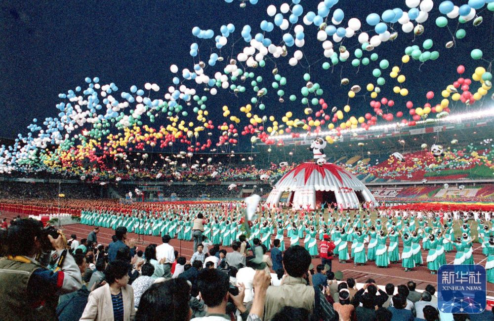↑1990年9月22日至10月7日,第十一届亚运会在北京举行。这是中国首次举办国际综合性运动会。图为开幕式现场。 新华社发(资料照片)