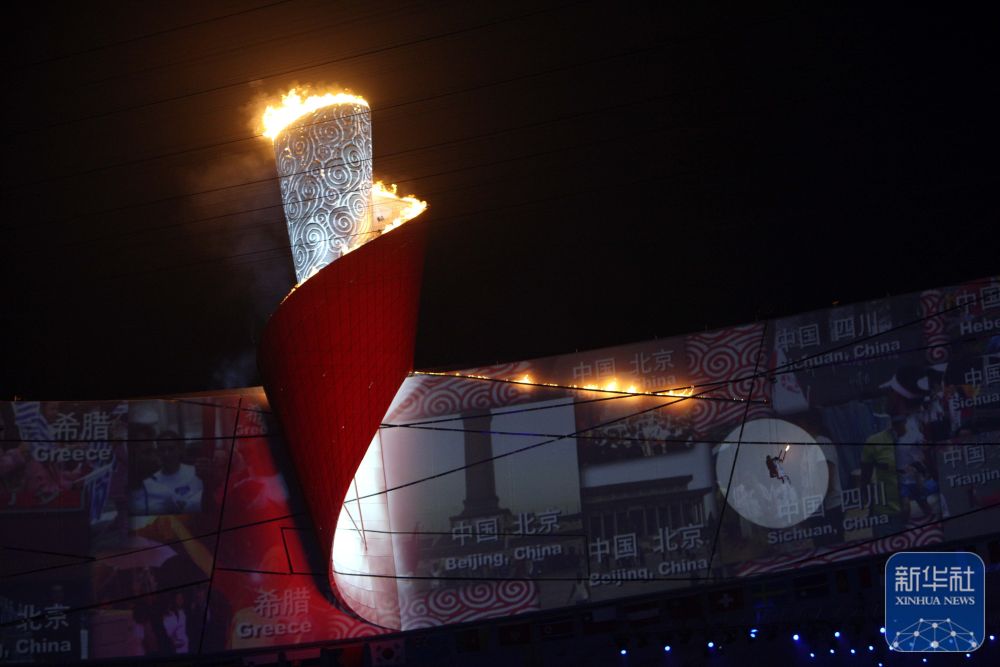 ↑2008年8月8日,最后一棒火炬手李宁在北京奥运会开幕式上点燃主火炬。新华社记者 姚大伟 摄