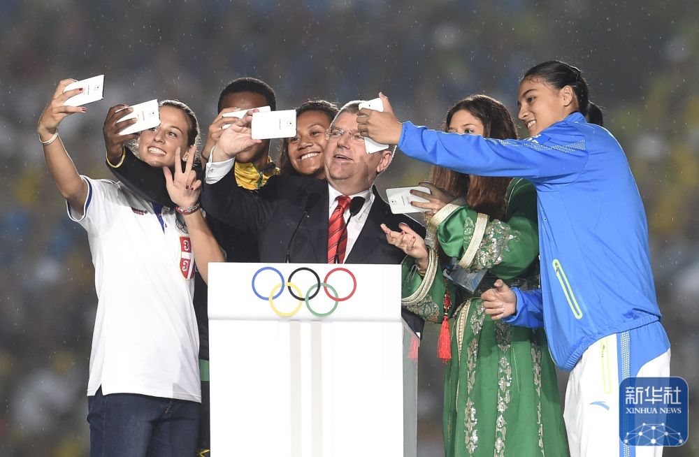 ↑2014年8月16日,国际奥委会主席托马斯·巴赫(中)与各代表团旗手在南京青奥会开幕式上用手机自拍。新华社记者 郭晨 摄