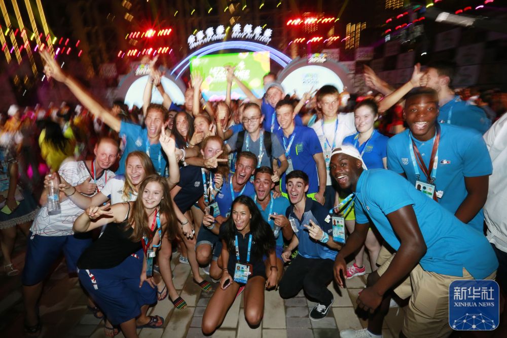 ↑来自全世界的青少年运动员在南京青奥村广场一起联欢(2014年8月15日摄)。 新华社记者 任正来 摄