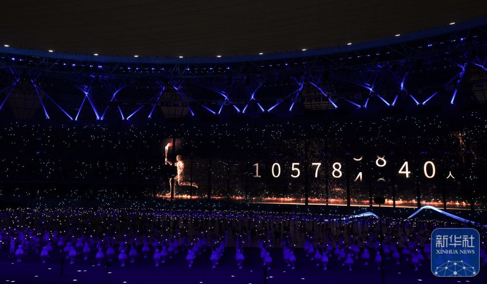 ↑2023年9月23日,数字火炬手在开幕式上进行火炬传递。当日,第19届亚洲运动会开幕式在杭州举行。新华社记者 杜宇 摄