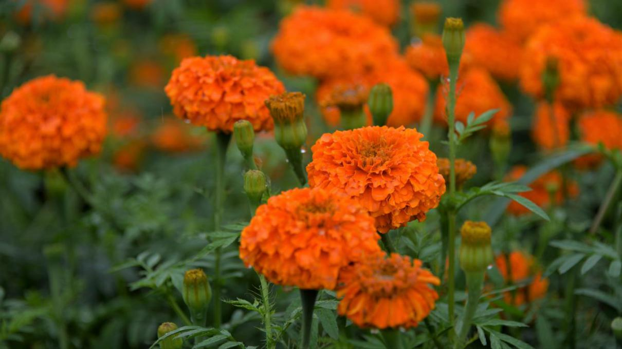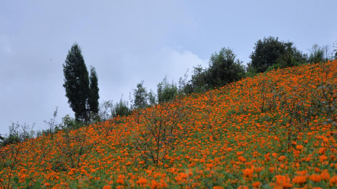 这时雨小了下来,告别正在生火燃炭准备烧烤的村民,慢慢下山。一片金黄的万寿菊就在路边,趁着雨停,驻足观赏。雨珠挂在枝叶、花瓣上,菊花鲜艳欲滴,清新逼人,偶有蝴蝶花间翩跹,更显生机。这片万寿菊沿坡种植,朵朵菊花盛放,这山坡就成了金色的海洋。风雨过山,又是一个丰收年。赏花间,大雨又作,只得再回车里,继续下山。