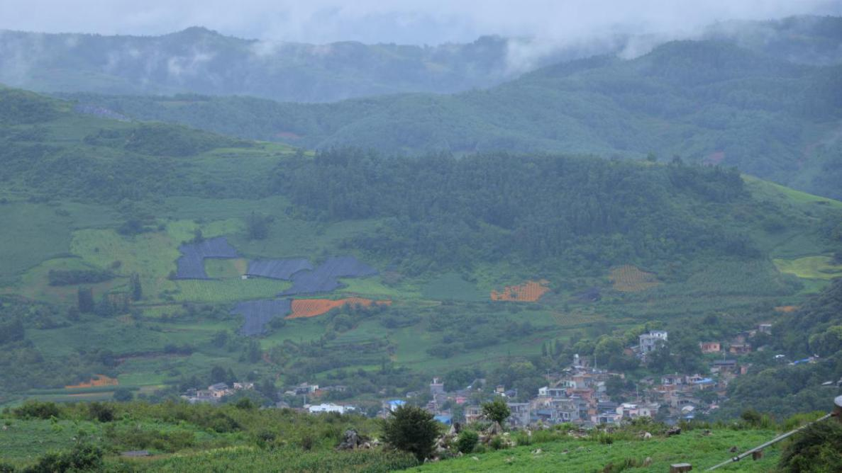 白云深处有人家,一个村庄就在近处的山坳里。依稀看到村里的房屋大都是二、三层的楼房,村子周围绿树茂密,山野田地,绿色深浅不一。田地里,金黄的是万寿菊,分外显眼。万寿菊可提取叶黄素,用途广泛,成了大山中的又一经济作物。黑色的遮网,种着三七,还种着一些包谷和其他作物,生机盎然。“耳锣山”是典型的喀斯特地貌,石多土少,土地贫瘠,用水困难,资源贫乏,历来是贫困山区,但近十年来,因地制宜,石头缝里刨穷根,大力发展苹果产业,成了有名的苹果之乡。