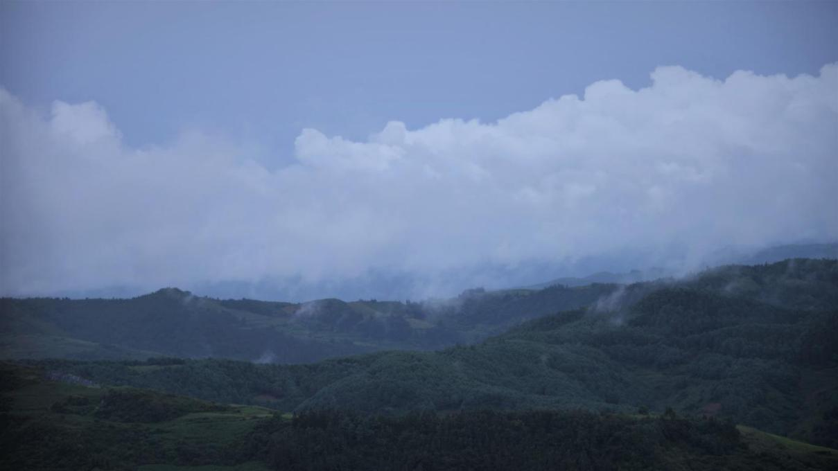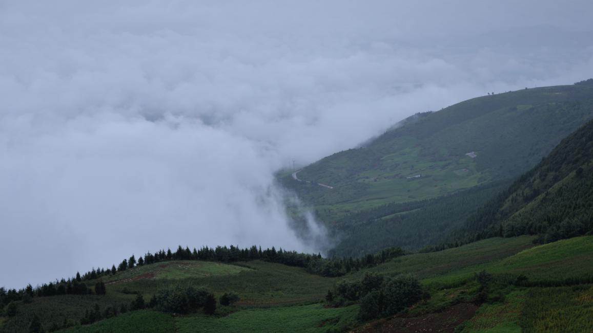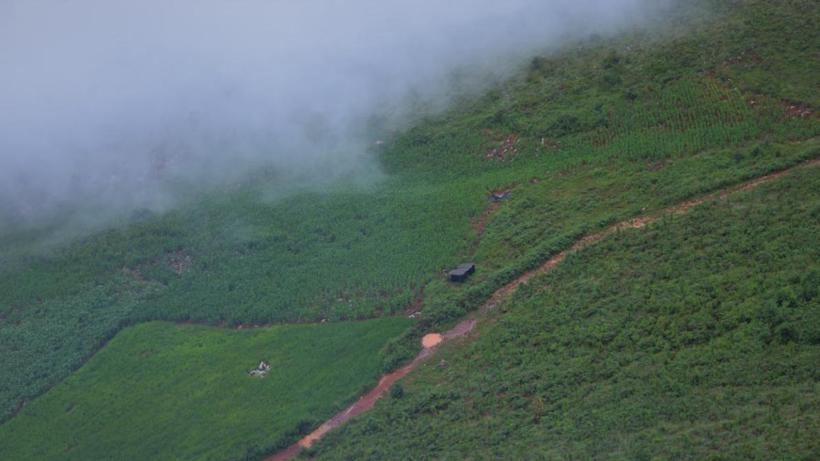 平台东西临崖处分别建有干栏式大棚房,遮阳避雨,更能凭高远眺。西瞰蒙自坝子,云遮雾挡,白茫茫一片,风云变幻间偶露空隙,看到长桥海平静如镜,如是晴天,可一览无遗,将是别样风景。在山下抬头看的云朵,此时成了脚下的云海。近处山崖深谷,云雾随意弥漫,时浓时淡,树木杂草、田地庄稼,一会裹成白色,一会有显出翠绿,青山如黛,云雾萦绕,如履仙境。