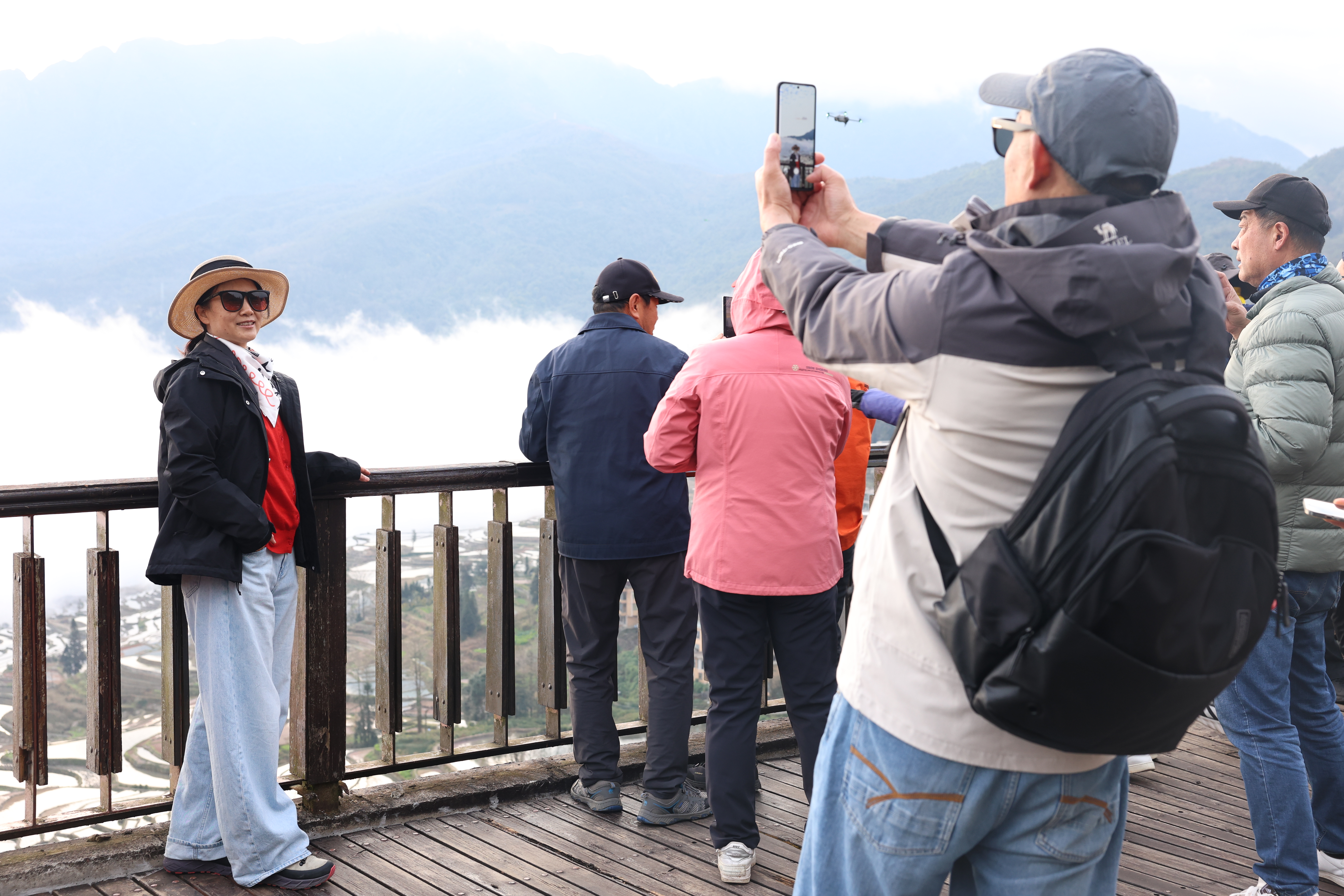 早晨7点,天空已泛起鱼肚白,游客们早已架起摄影设备,脸上满是兴奋与期待。“我早上6点20分就到观景台了,就为目睹心心念念的哈尼梯田美景。以这种方式跨年,特别有仪式感!”山东游客林艳激动地说。