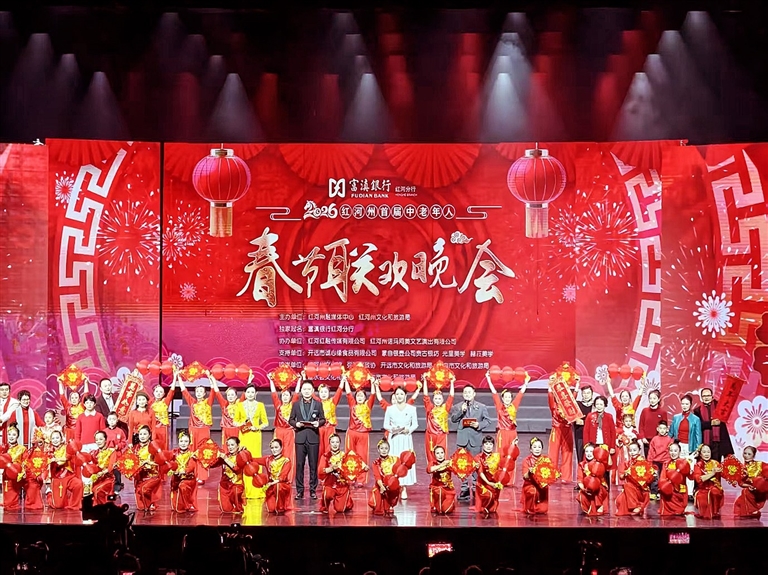 本网讯 春满红河岸,银龄庆团圆。近日,由红河州融媒体中心、红河州文化和旅游局联合主办,富滇银行红河州分行独家冠名的2026年红河州首届中老年人春节联欢晚会在红河大剧院完成录制。来自全州19支中老年文艺团队的500余名参演人员同台献艺,用饱含深情的表演,为马年新春献上兼具岁月质感与地域韵味的文化盛宴。