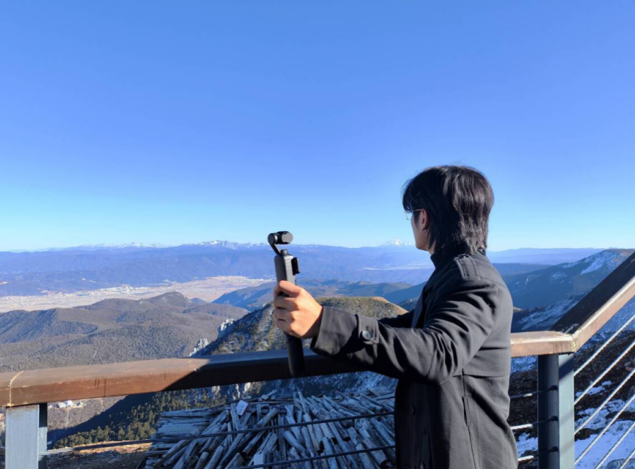越南知名博主黎日观在石卡雪山山顶进行视频创作