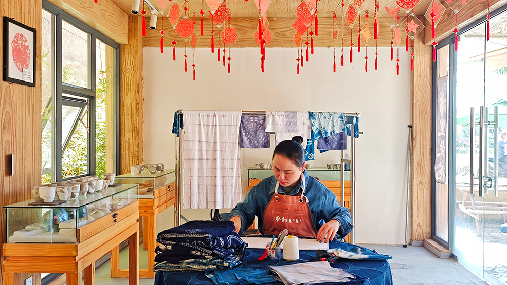 旅居客在弥渡县红岩镇白崖古城村体验扎染手工技艺。杨文虹摄