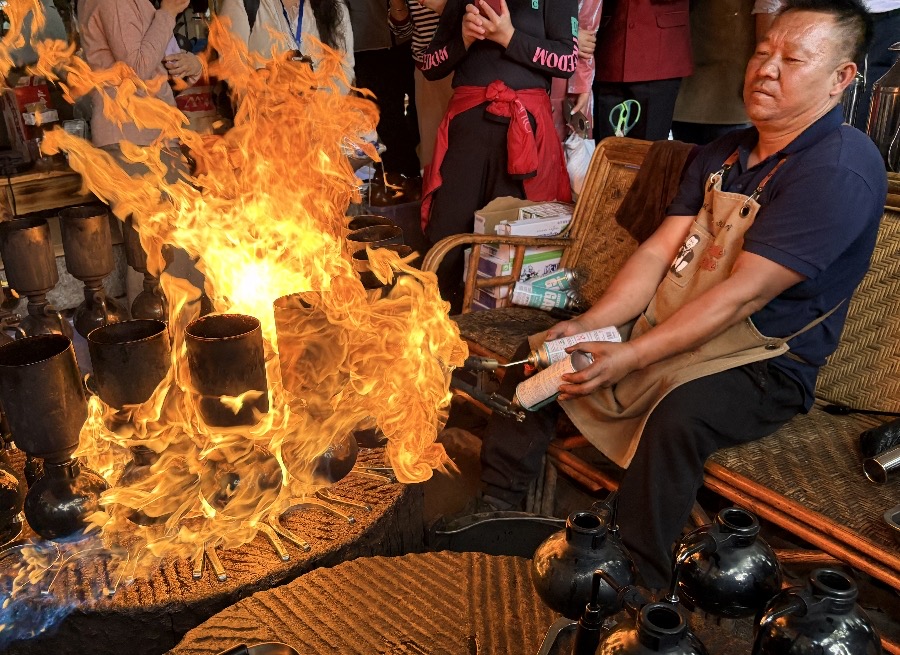 “咖叔”李金合正在制作火烧咖啡(3月25日摄)。