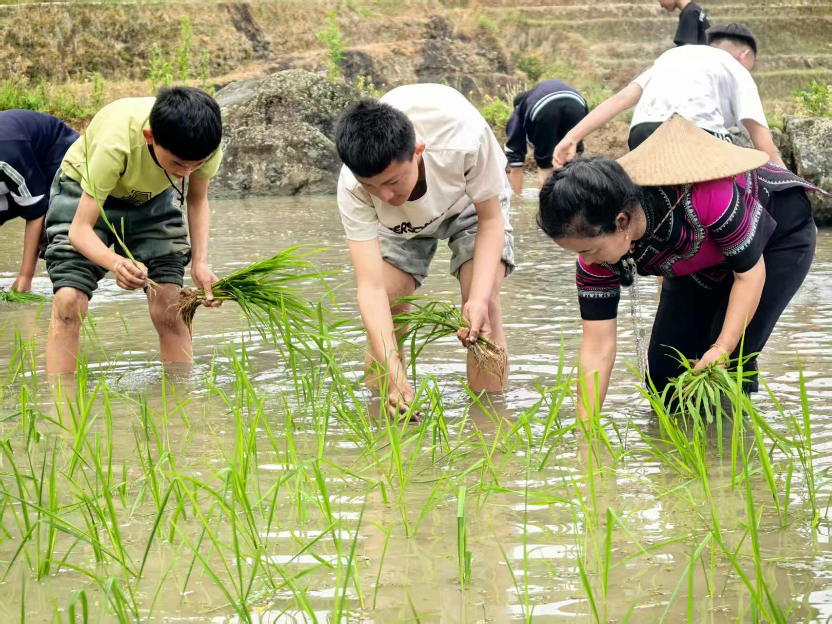 卷起裤腿踏入泥田,弯腰插秧体悟辛劳。参与活动的青少年们满怀热忱,全身心投入农耕实践。起初,不少同学在水田中步履维艰,插秧动作生疏笨拙,秧苗栽种歪斜松散,在老师们的耐心指导、逐一纠错下,大家逐渐掌握耕作要领,弯腰、分苗、插秧、扶正,动作从生涩走向娴熟,协作配合愈发默契。经过一番辛勤劳作,一行行整齐嫩绿的秧苗扎根梯田,在春风中摇曳生姿,为千年世遗梯田增添了一抹鲜亮的青春底色,也让同学们在汗水与劳作中,真切读懂“一粥一饭当思来之不易”的深刻内涵。