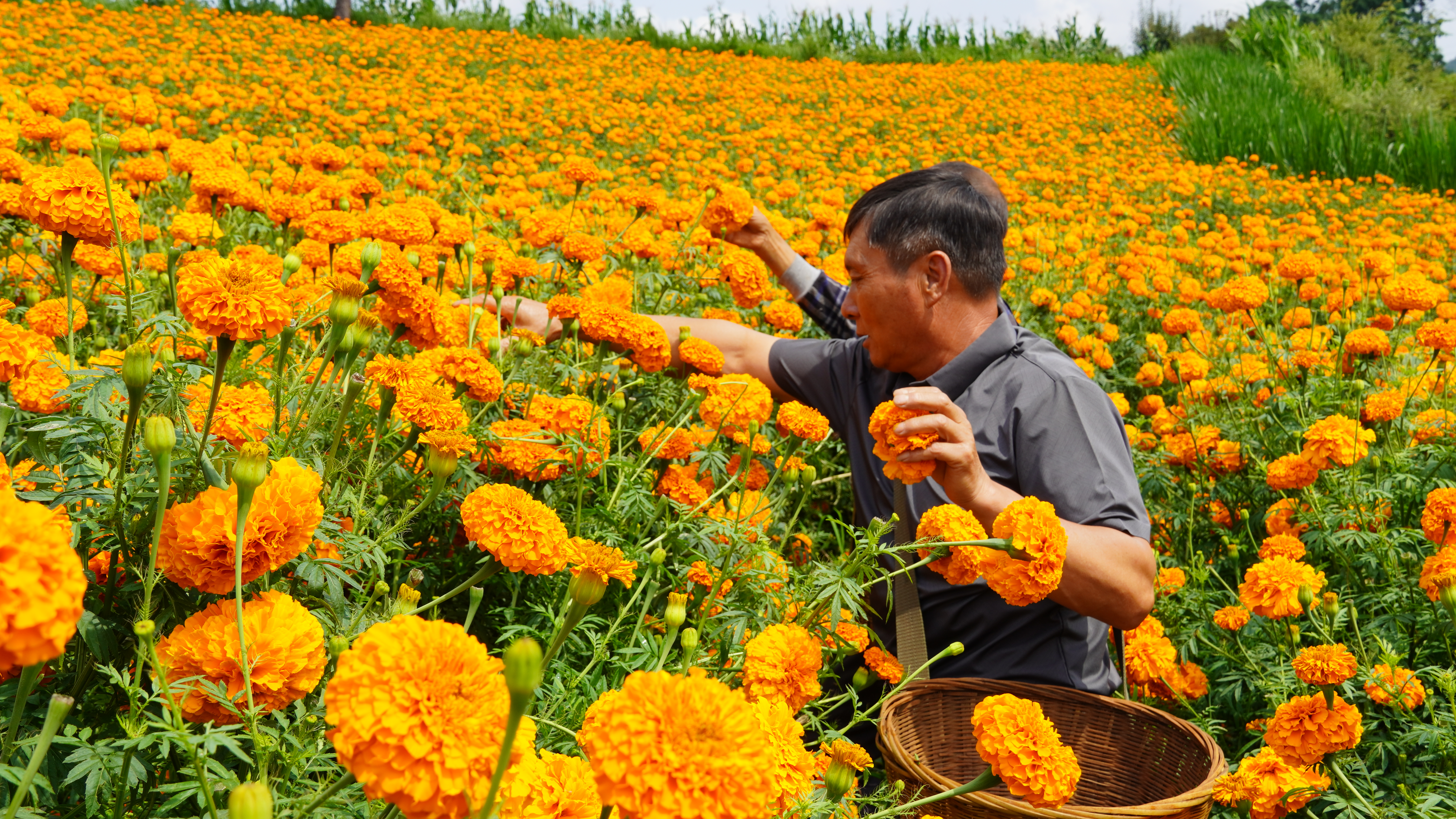 “这已经是采摘第三茬了,我家种了10余亩万寿菊,预计能收30余吨,光是这一项就能带来4万元左右的收入。”白水镇山黑村委会化乐村民小组的种植户周彦伟一边摘花一边笑着说,“从育苗、栽种到管护,都有技术员指导,花摘完直接送到收购点,一周左右钱就打到卡上,特别省心。”