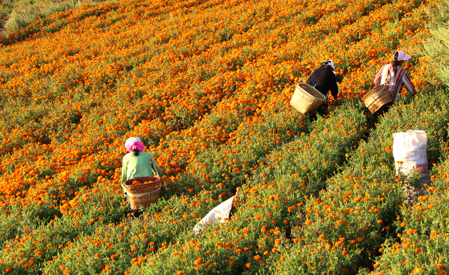 期路白苗族乡是多民族聚居乡,山多地少的地形曾一度制约当地农业产业发展。近年来,乡党委和政府立足气候、土地资源优势,瞄准万寿菊“短平快、高收益”的特点,将其培育为特色主导产业。通过引进红河立达尔农业开发有限公司、石屏伊红生物科技有限公司两家企业入驻,构建起“企业+合作社+农户”的利益联结机制,彻底解决了过去“种得出、愁销路”的难题。