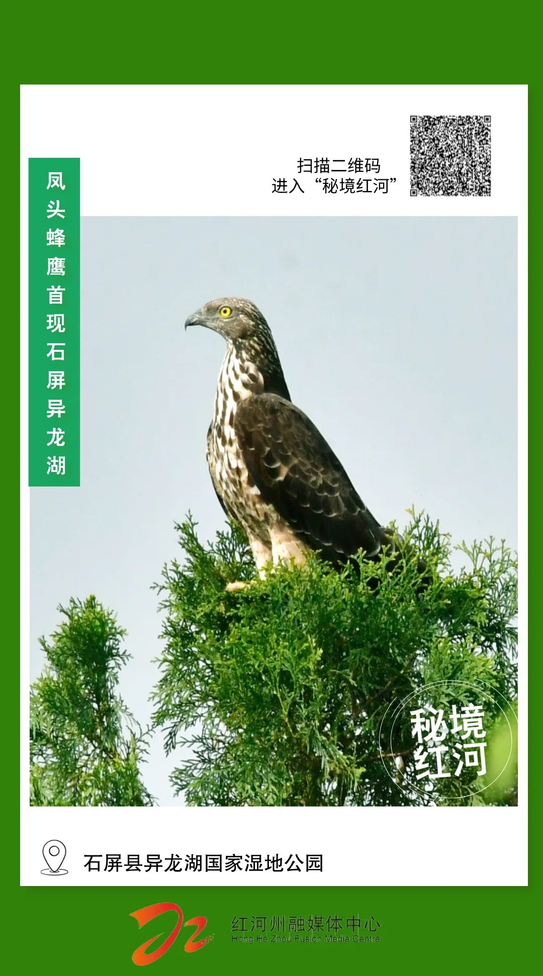 凤头蜂鹰,又称东方蜂鹰、八角鹰、雕头鹰、蜜鹰,隶属于隼形目鹰科蜂鹰属,因头部冠羽状似“凤头”且喜食蜂类幼虫而得名。它通常栖息于山区、丘陵的阔叶林、针叶林及混交林中,活动海拔最高可达1800米,对生态环境变化极为敏感。它的出现,标志着异龙湖的生态系统正朝着更加稳定、健康的方向稳步发展。