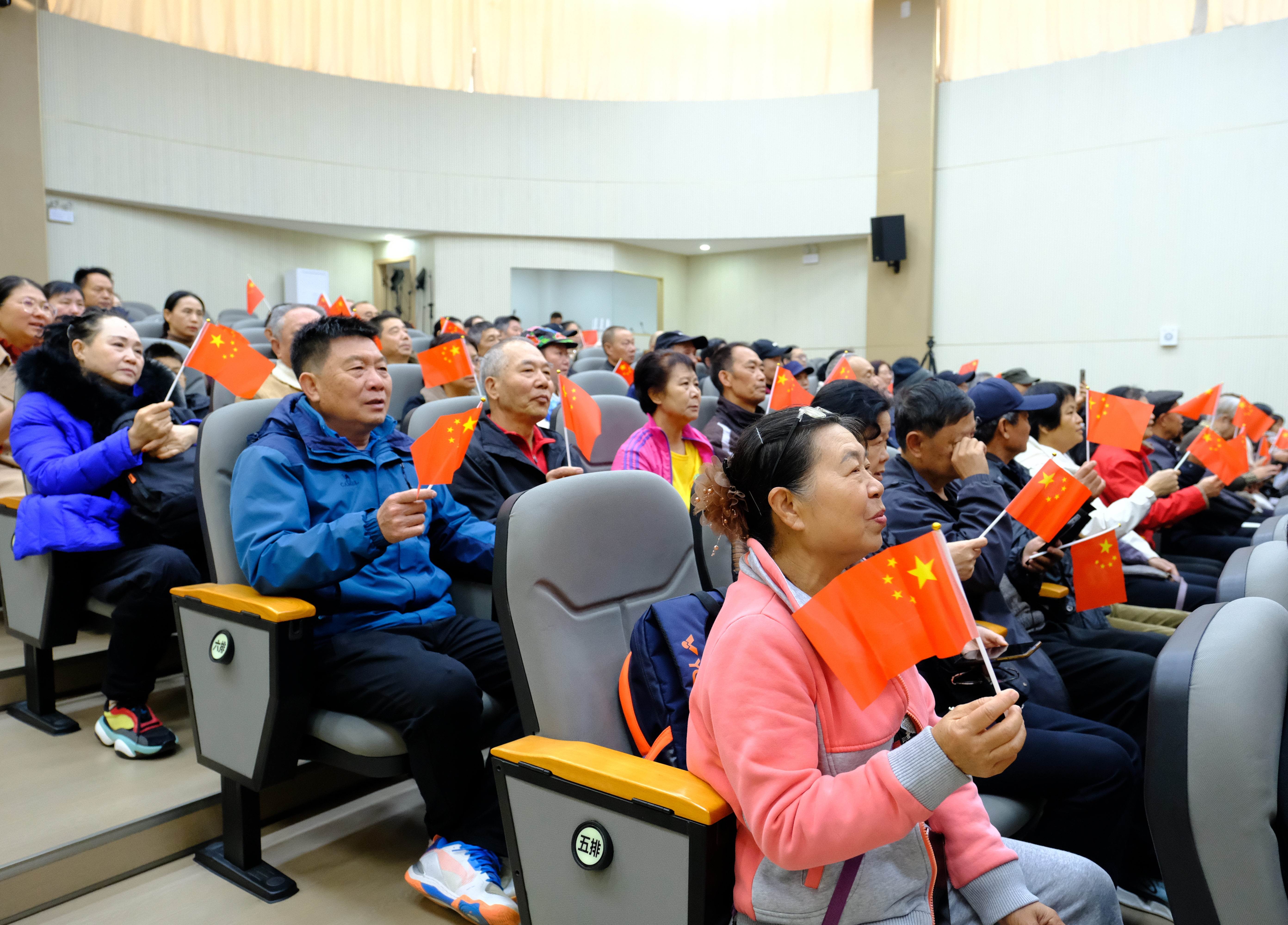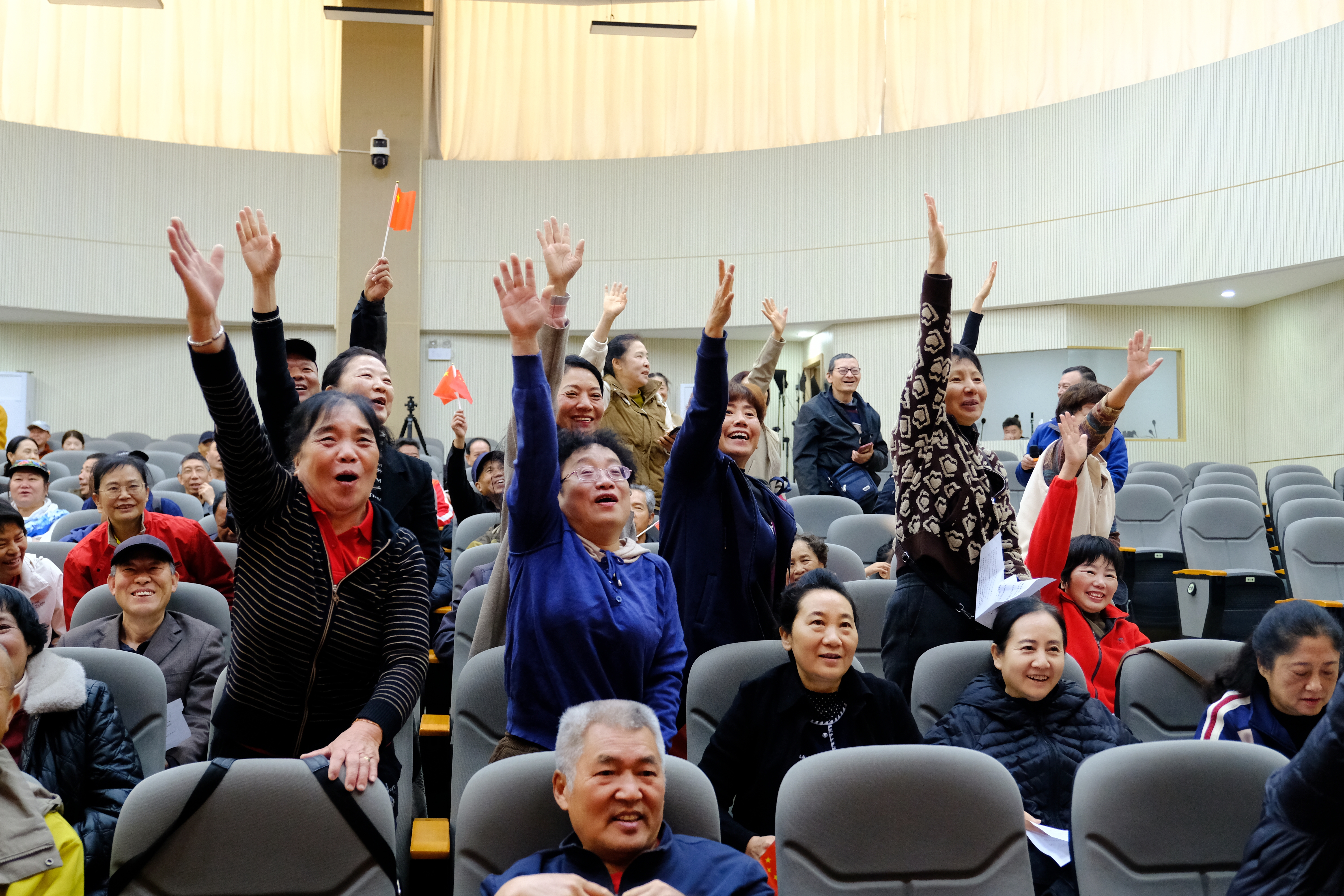 “起来!不愿做奴隶的人们……”熟悉的前奏响起,在场退休干部全体起立,齐声高唱国歌。紧接着,在老师引唱下,大家又相继唱响《新年好》等歌曲。活动现场,老同志们轻轻打着节拍,手中红旗不停舞动,胸前党员徽章在歌声中愈发闪亮。