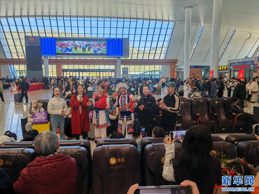 歌舞快闪、非遗体验、云品展示、书法楹联送福……云南铁路新型公共文化空间建设暨2026年“花开四季·‘香’约云南”系列群众文化活动11日下午在昆明南站候车厅开幕。