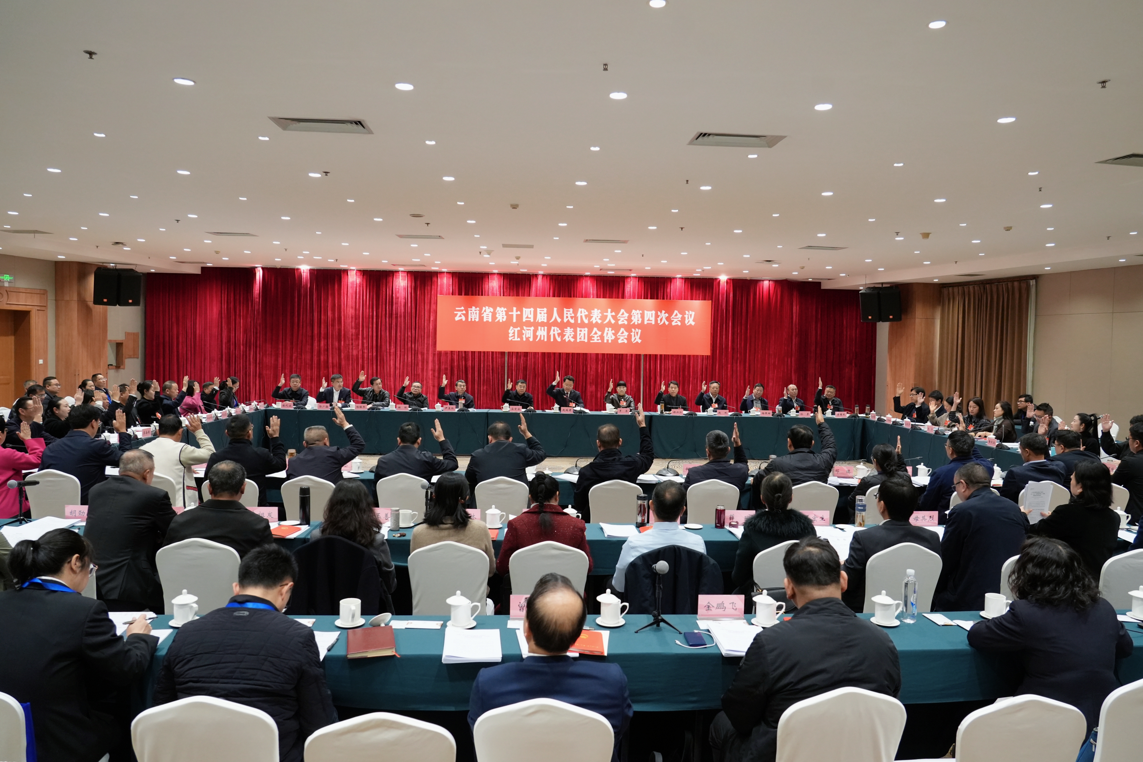 红河州代表团团长赵瑞君主持会议。罗萍、应亥宗、姬兴江、李国民、陈代波等参加审议。