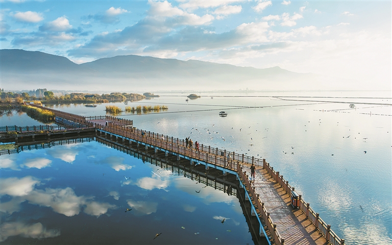 异龙湖木栈道一景。 图片由石屏县融媒体中心提供