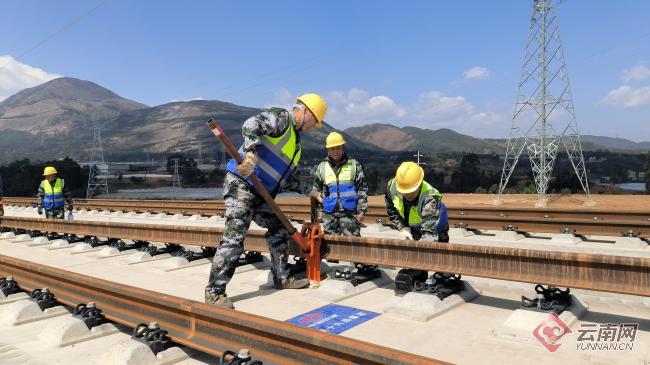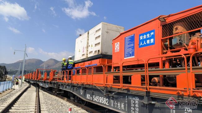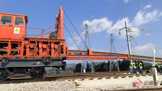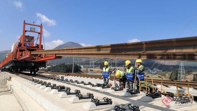 3月18日上午,在云南昆明崔家庄铺轨基地,随着中铁十六局铺轨机的精准作业,第一对500米长钢轨稳稳落在无砟轨道上,标志着渝昆高铁昆明往重庆方向的铺轨施工正式启动,渝昆高铁建设取得重大突破。