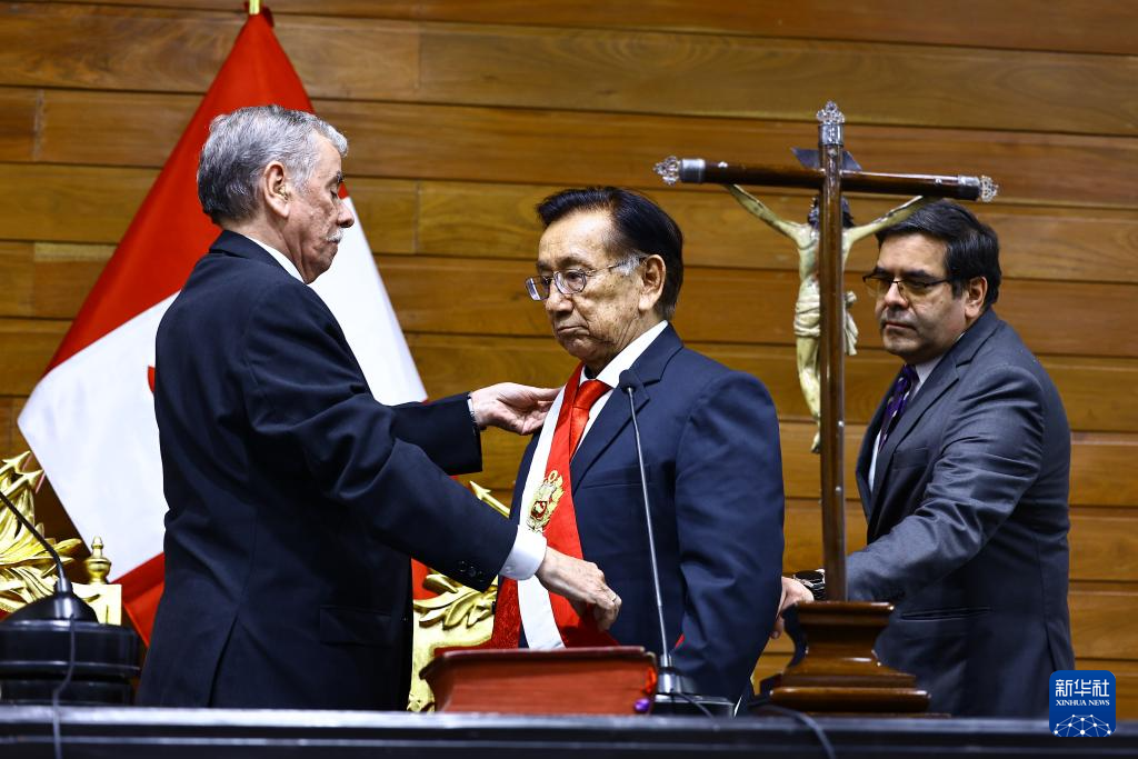 2月18日,在位于首都利马的秘鲁国会,何塞·巴尔卡萨尔(中)戴上总统绶带。新华社发(秘鲁国会供图)