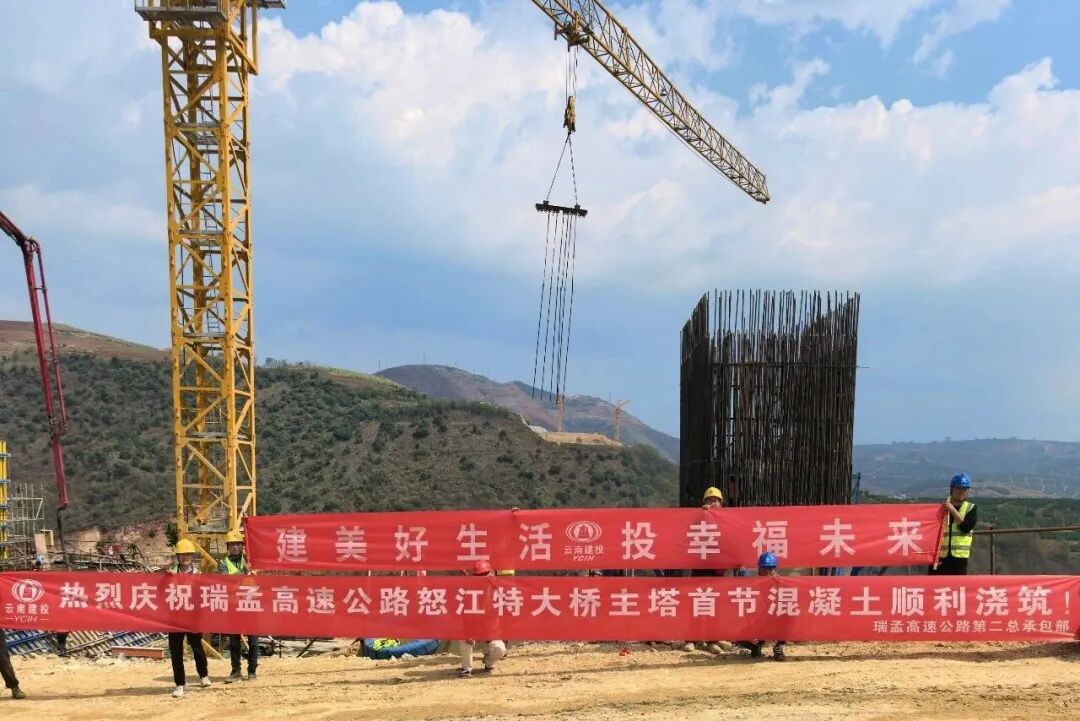 近日,瑞丽至孟连高速公路(保山段)勐糯怒江特大桥主塔首节混凝土顺利完成浇筑。勐糯怒江特大桥位于保山市龙陵县与临沧市镇康县交界,横跨怒江峡谷,桥梁全长1373米,主桥采用210+800+210米单跨简支悬索桥结构,瑞丽岸主塔高95.3米,孟连岸主塔高142.9米。本次浇筑的孟连岸主塔首节段高4米,浇筑方量233立方米。