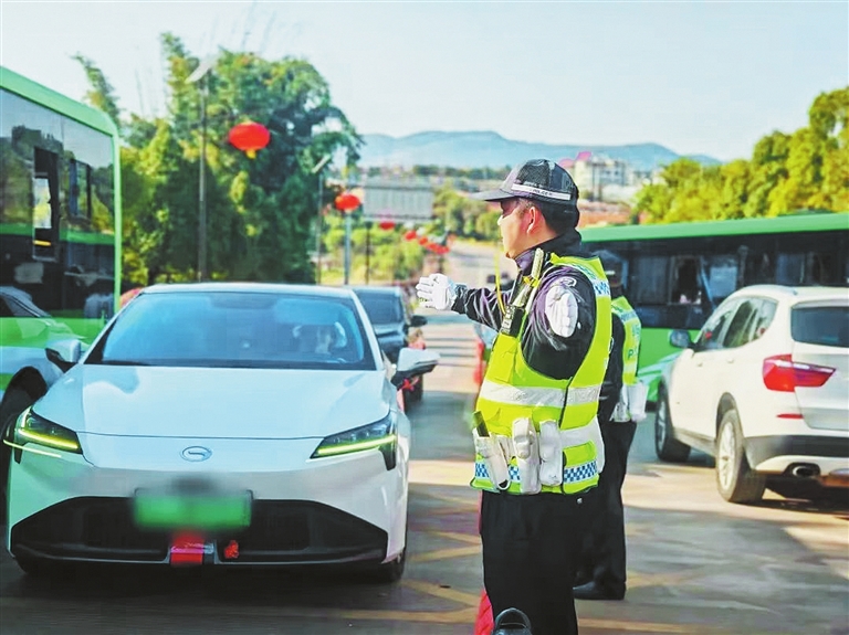 弥勒市公安局交通管理大队交警在疏导交通。