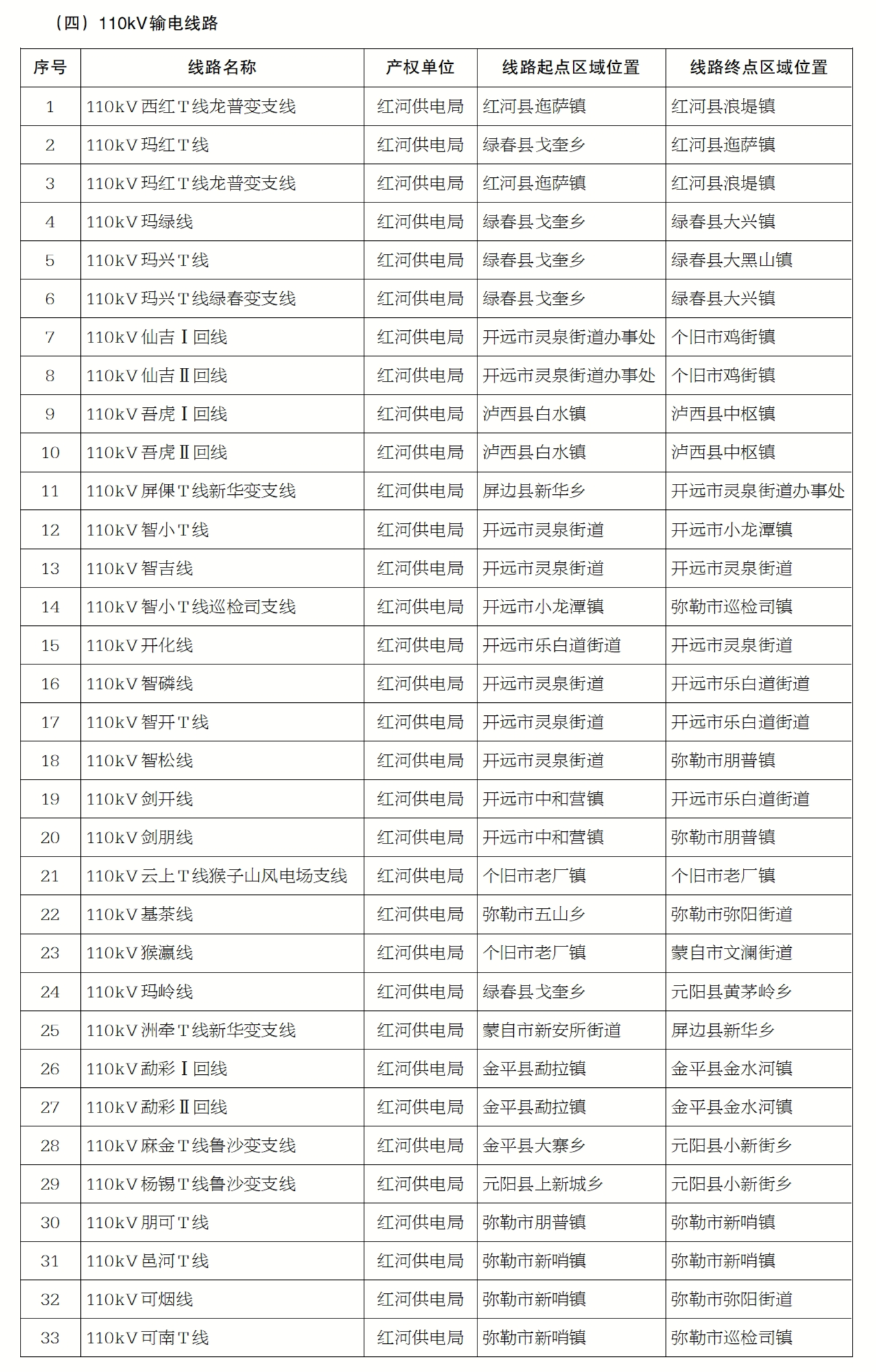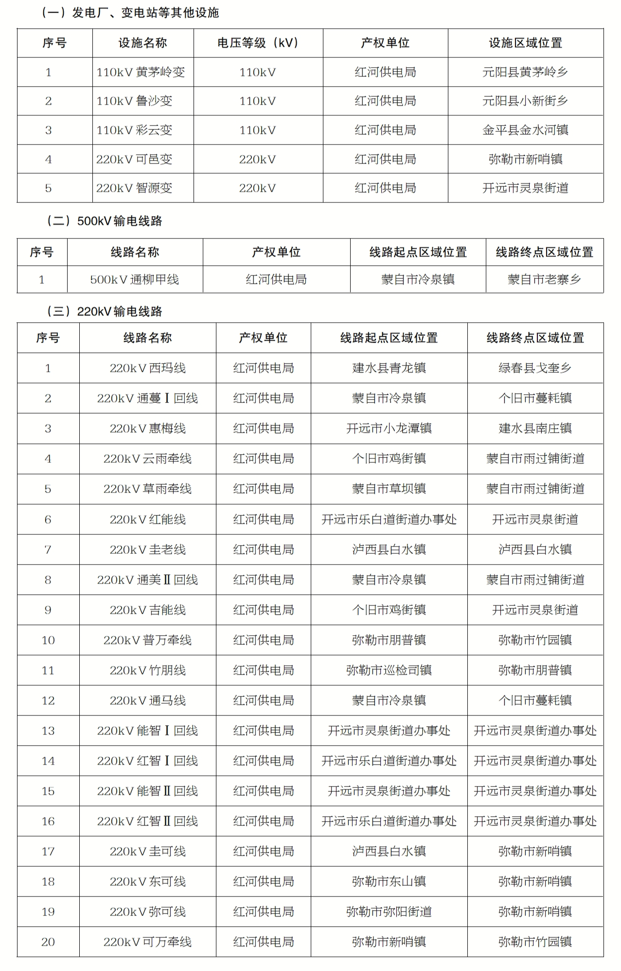 根据《中华人民共和国电力法》、国家《电力设施保护条例》和《云南省电力设施保护条例》相关规定,红河州电力运行主管部门对110kV至500kV电压等级的110kV黄茅岭变、110kV西红T线龙普变支线等电力设施保护区予以划定,现公告如下: