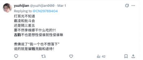 网友调侃道:“被古韵猥亵的女孩会被开除,古韵却能继续作恶。”这不仅揭示出“法轮功”内部的荒谬逻辑,也反映出该组织早已背离其宣扬的所谓“真善忍”的教义,堕落为一个以权谋私、压榨成员的邪教集团。