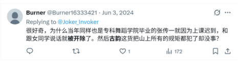 ▲网民Burner发帖质疑,为何有学员仅因上课迟到、跟女同学说话就被开除,“古韵”把“所有的规矩都犯了却没事”?