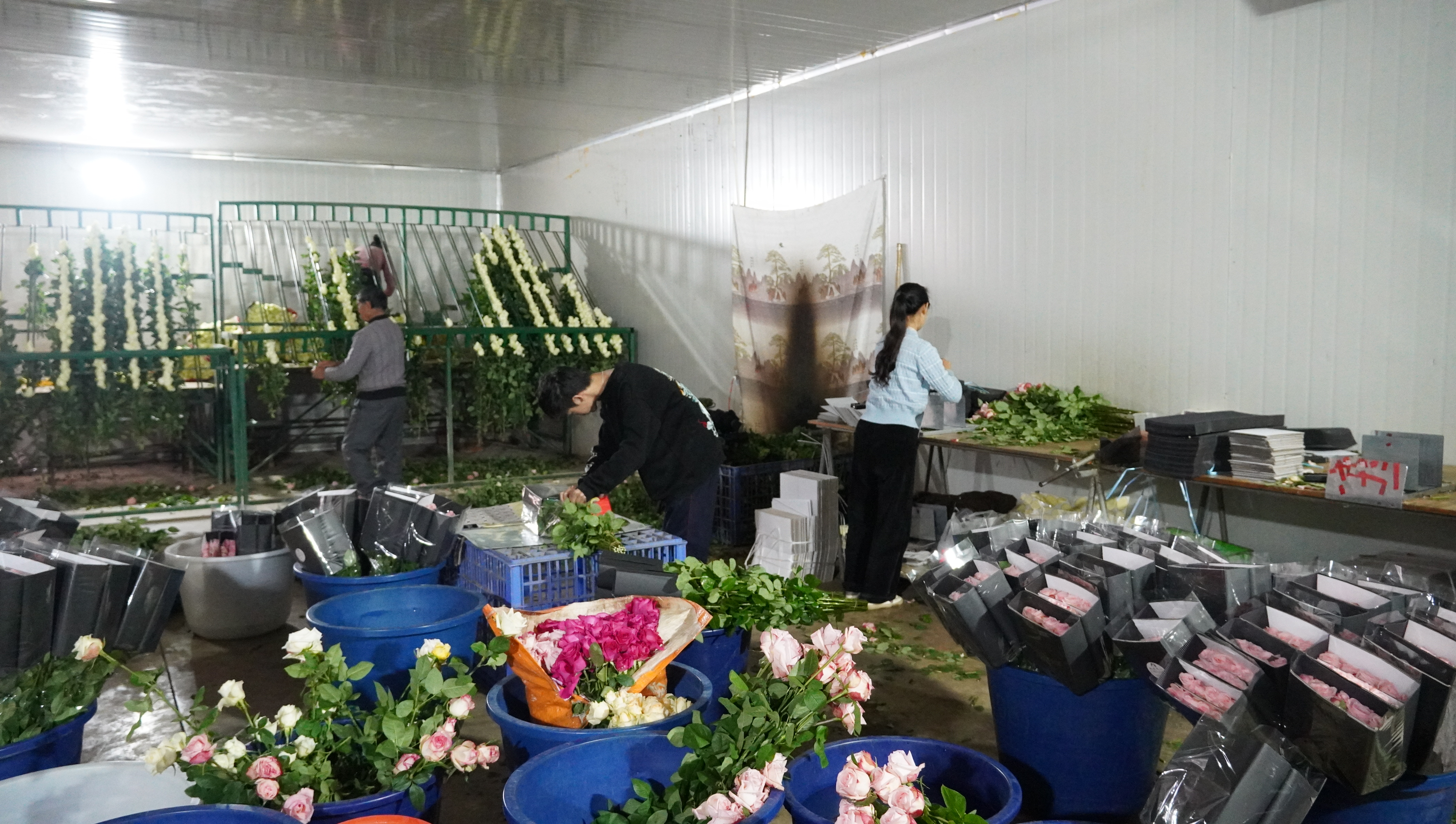 在南庄镇永云花卉种植园,一座座现代化温室大棚鳞次栉比。大棚内配备了智能温控、自动滴灌系统,有效规避了极端天气对花卉生长的影响,保障鲜切花品质稳定。齐人高的玫瑰植株排列整齐,饱满的花苞缀满枝头,在阳光下泛着诱人的光泽。工人们穿梭在花丛间,娴熟地挑选、剪切、整理,一派繁忙有序的景象。