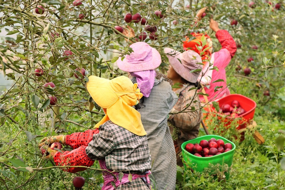 村民采摘苹果。