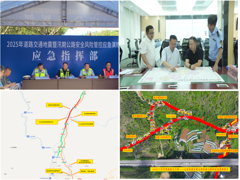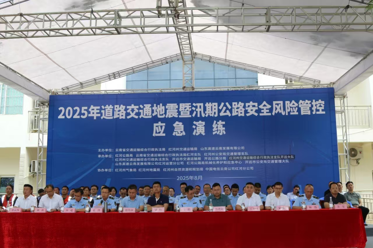 2025年8月8日上午,红河州交通运输局、云南省交通执法局、山东高速云南发展有限公司联合主办“2025年地震暨汛期公路安全风险管控应急演练”,红河州交通运输综合执法支队、红河州公安局交管支队、红河公路局、省交通执法局红河支队、开远市交通运输局、开远市公安局交管大队、开远公路分局、红河州交通运输执法支队开远大队等单位承办,州县气象、自然资源规划部门参与,共计260余人参加演练。演练模拟开远市乐白道街道楷甸村委会片区发生7级强震并伴随特大暴雨的严峻场景,地震造成通往灾区的多条公路不同程度受损,公路沿线多处坍塌,急需抢通生命救援通道和转移安置受灾群众。